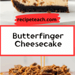 Butterfinger Cheesecake with Caramel Drizzle is a decadent dessert featuring a rich chocolate cookie crust, creamy cheesecake loaded with chopped Butterfinger candy bars, and topped with even more candy and a luscious caramel drizzle. It’s the ultimate treat for candy and cheesecake lovers alike.