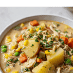 Chicken Pot Pie Soup is a comforting and hearty dish that combines tender shredded chicken, diced potatoes, and mixed vegetables in a creamy, savory broth. All the flavors of a classic chicken pot pie are transformed into a warm, satisfying bowl perfect for any day.