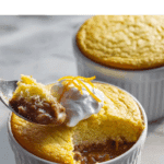6. Top Chili with Cornbread: Spoon and gently spread about ½ cup of the cornbread batter evenly over the chili in each ramekin, creating a crust layer on top.