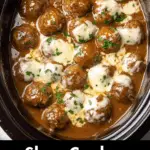 This Crock Pot French Onion Meatballs recipe features tender meatballs slow-cooked with caramelized onions and a savory brown gravy, topped with melted Gruyere cheese for a comforting and flavorful dish perfect for an easy weeknight dinner.