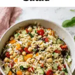 Yes, you can substitute orzo with small pasta shapes like couscous, small shells, or even mini penne. However, orzo’s rice-like size makes it ideal for coating with dressing and mixing with the small chopped ingredients.