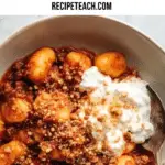 - Serve: Spoon the gnocchi and meaty tomato sauce into bowls. Top each serving with a generous dollop of the herbed ricotta and sprinkle with golden crispies to add a delightful crunch.