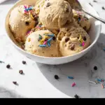 A white bowl holds three scoops of light brown ice cream with a soft and slightly crumbly texture. The ice cream scoops have a smooth, creamy center with rougher edges, placed close to each other. A silver spoon rests inside the bowl on the right side, partially submerged in the ice cream. The bowl is set on a white marbled surface, scattered with a few dark brown chocolate chips around it. photo taken with an iphone --ar 4:5 --v 7
