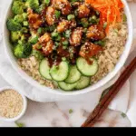 Now comes the fun part: building your bowl! Start with a generous scoop of cooked rice as the base. Layer on steamed broccoli florets, shredded carrots, and crisp sliced baby cucumbers, then pile on your saucy teriyaki chicken. Finish by scattering sliced green onions and a sprinkle of sesame seeds for color, crunch, and that authentic restaurant-worthy touch.