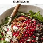- Assemble the Salad: In a large bowl, combine the cooled wild rice, chopped rocket, dried cranberries, toasted pecans, and sliced green onions. Add half of the crumbled feta cheese and pomegranate seeds. Pour most of the dressing over the salad and toss gently to combine.